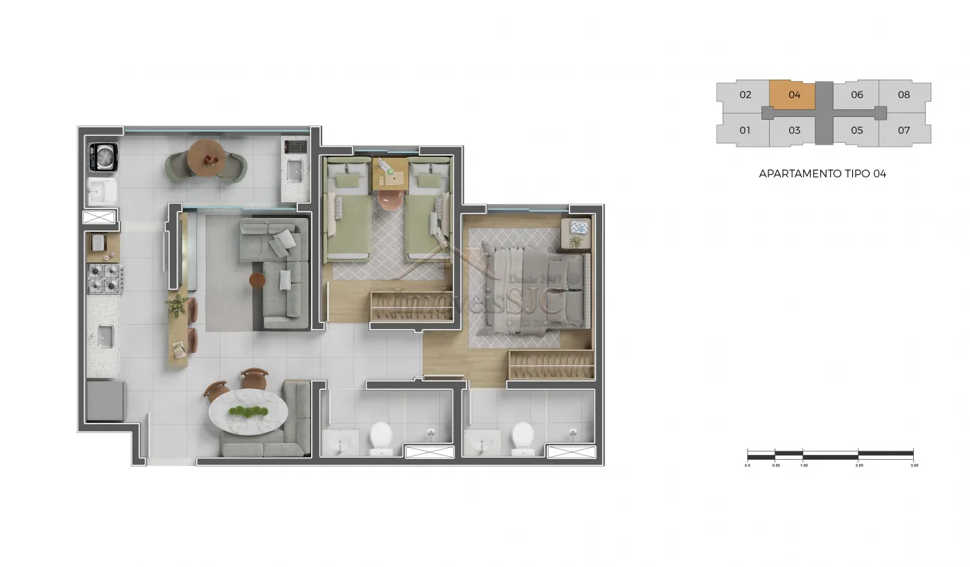 Apresentamos este moderno apartamento com 67,64 m², localizado em um empreendimento residencial na privilegiada zona sul de São José dos Campos, pensado para unir conforto e praticidade. A unidade dispõe de 2 dormitórios, incluindo uma suíte ampla e bem iluminada, proporcionando privacidade e aconchego.