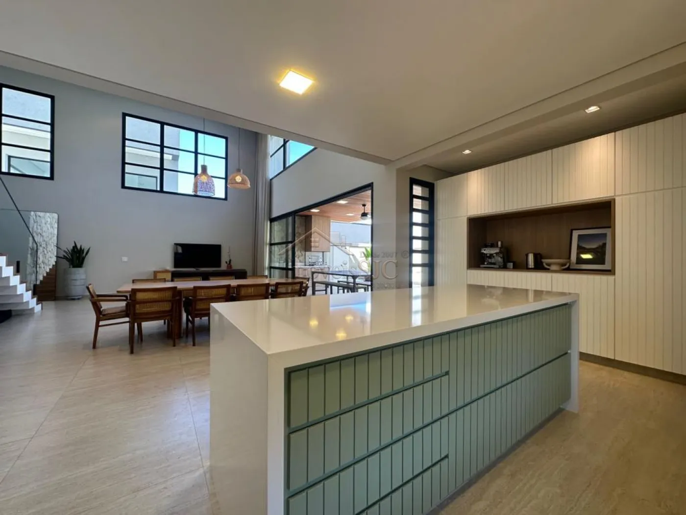 A ampla sala com pé direito duplo e uma cozinha totalmente planejada combinam entre si para criar um espaço expansivo e convidativo ao mesmo tempo.