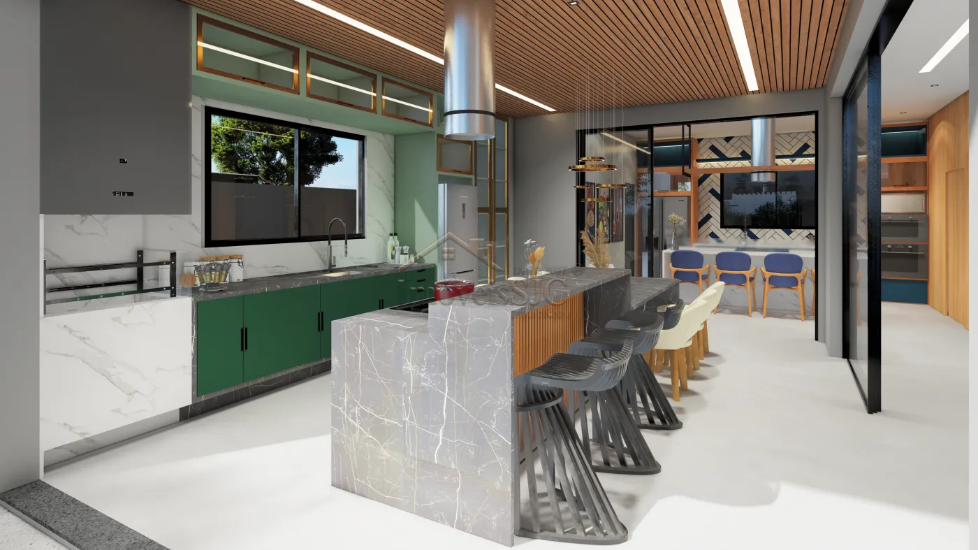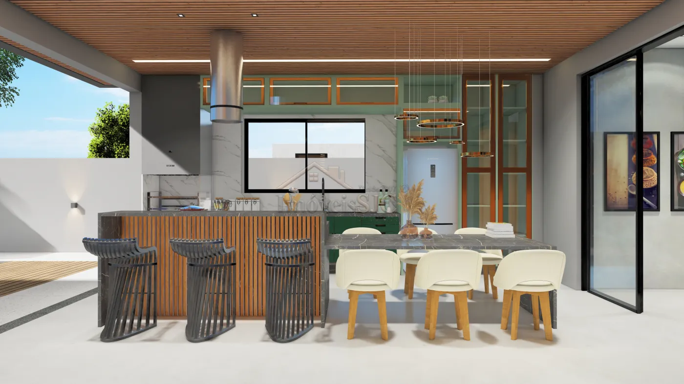 A área social é um verdadeiro destaque, com uma cozinha ampla e funcional integrada à cozinha gourmet com churrasqueira, ideal para receber com charme e descontração. O imóvel conta com seis banheiros e marcenaria planejada em toda a área comum e nos banheiros, valorizando ainda mais os espaços.