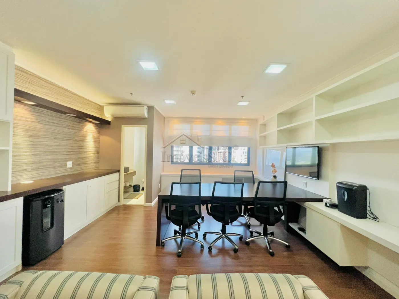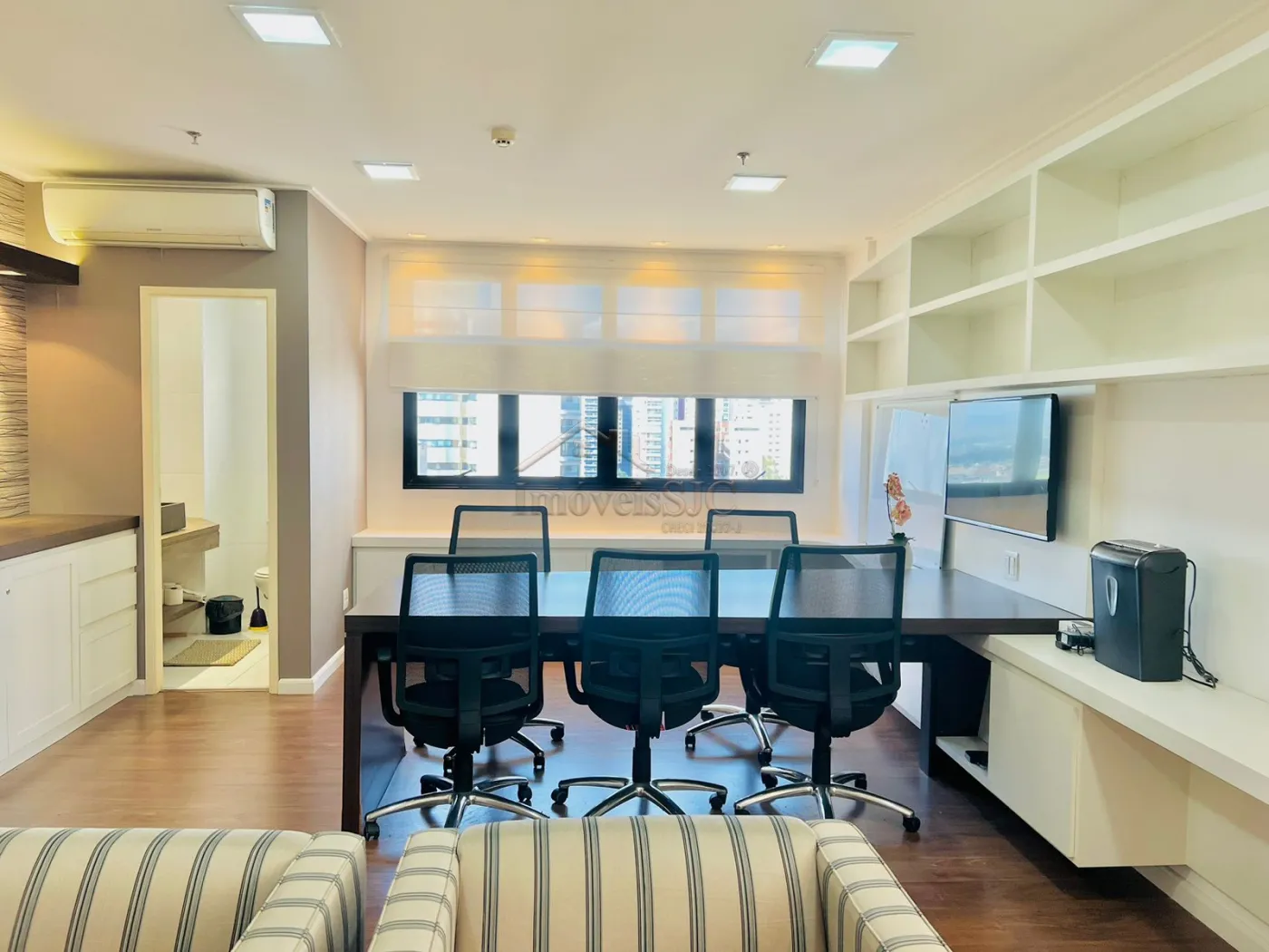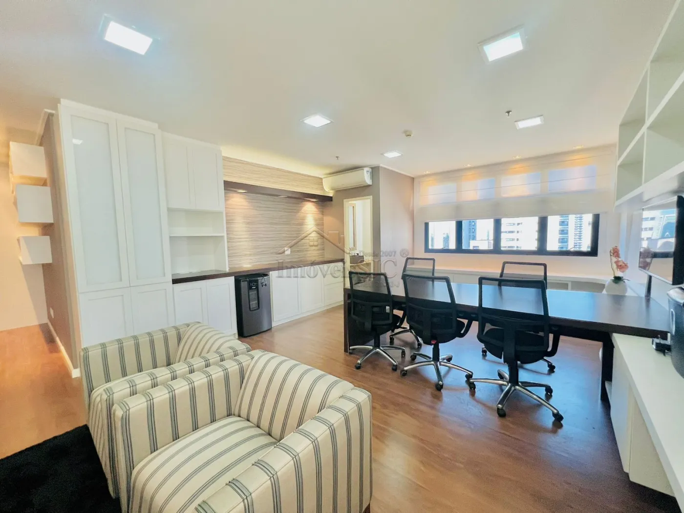 Sala comercial com 54m², montada com marcenaria completa, ar condicionado, poltronas, persianas, cadeiras de escritório, Vista Permanente para o Jardim Aquarius em excelente localização para seu negócio com lojas estabelecidas no térreo e 2 horas de estacionamento grátis para clientes.